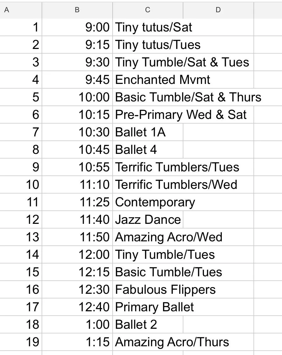 Hair & makeup to be done PRIOR to arriving at the theatre. All performers arrive dressed in 1st Costume, bring all shoes necessary/ labeled with your child's Name, and any additional costumes, if in multiple styles of dance or tumbling.